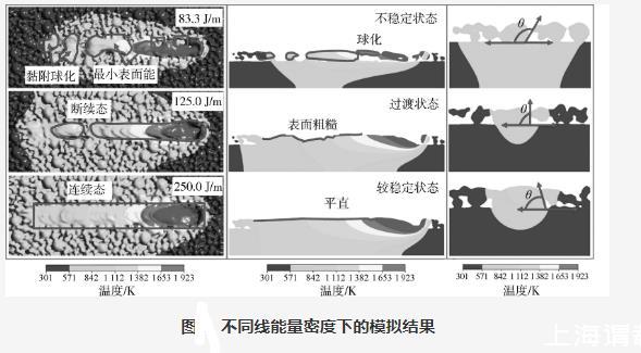 為分析線能量密度對球化缺陷形成機(jī)理的影響,選取激光功率150 W,線能量密度分別為83.3 J/m、125.0 J/m和250.0 J/m的3組參數(shù)進(jìn)行數(shù)值模擬,結(jié)果如圖2所示。當(dāng)線能量密度為83.3 J/m時,部分熔融金屬凝固并與周圍粉末黏附成球;部分熔融金屬在表面張力的驅(qū)使下傾向于減少表面能,迅速地成球;這兩種成球方式往往共同出現(xiàn)。這是因為激光的穿透深度沒有到達(dá)基板,此時接觸角為180°,呈現(xiàn)不完全濕潤狀態(tài),液態(tài)金屬流動受阻,因此不能在基板上鋪展。當(dāng)線能量密度提高到125.0 J/m時,單道由球化形態(tài)向斷續(xù)態(tài)過渡,雖然表面還比較粗糙,但是球化效應(yīng)明顯減弱,此時激光穿透深度剛剛到達(dá)基板,接觸角約為90°。當(dāng)線能量密度繼續(xù)提高到250.0 J/m時,熔化的金屬粉末形成充足的熔融金屬,從而改善其流動性,凝固后獲得高度均勻和連續(xù)的單道,激光穿透深度能夠穿透粉末床并熔化基板,并且接觸角大于90°。因此,球化缺陷的形成機(jī)理可以總結(jié)為能量密度太低,熔融金屬不能在基板上鋪展。判斷是否球化最直接的依據(jù)是觀察熔池深度是否穿透粉末層厚,并熔化了基板,也可以計算熔池的接觸角是否小于90°來判斷熔池的濕潤性。此外,還可通過適當(dāng)提高線能量密度,提高熔融金屬的流動性,以獲得更均勻和連續(xù)的單道。