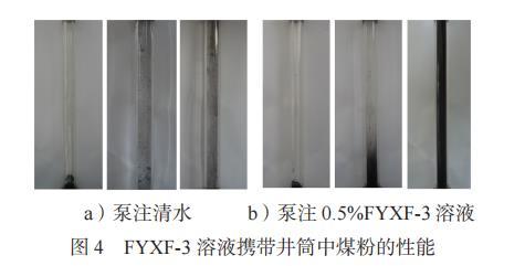 由圖4a)看出,裝有清水的有機(jī)玻璃管底部的煤粉沒有被懸浮,且泵注后,排出液中幾乎沒有攜帶出煤粉。由圖4b)看出,裝有0.5%FYXF-3溶液的有機(jī)玻璃管底部的煤粉被懸浮,且泵注后,排出液為黑色渾濁液體,攜帶出煤粉質(zhì)量為0.25g??梢钥闯?,濃度為0.5%的FYXF-3溶液對(duì)煤粉的懸浮性能較好,可以將井筒堆積的韓城現(xiàn)場(chǎng)煤粉懸浮,并隨著返排液返排至地面。