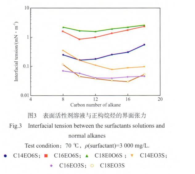 用模擬臨盤油田地層水將脂肪醇聚氧乙烯醚磺酸鹽配制成質(zhì)量濃度為3 000 mg/L的溶液,在70℃下測得C14EO3S,C16EO3S,C18EO3S表面活性劑與原油間的界面張力分別為0.076,0.041,0.034 mN/m。表面活性劑溶液與正構(gòu)烷烴的界面張力見圖3。
