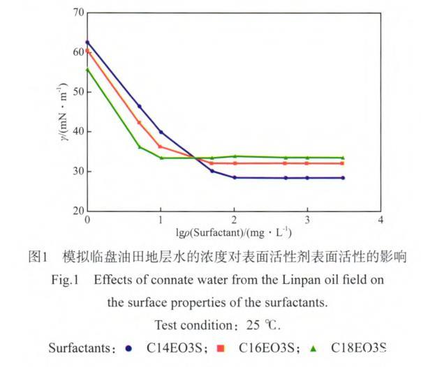 使用模擬臨盤油田地層水將表面活性劑配制成溶液,考察油田地層水對表面活性劑表面活性的影響,實(shí)驗(yàn)結(jié)果見圖1。由圖1可看出,在該油田地層水中,C14EO3S,C16EO3S,C18EO3S的cmc依次為80,40,10 mg/L,其所對應(yīng)的γcmc分別為28.86,32.38,33.75 mN/m。與C14EO3S在蒸餾水中的cmc相比,C14EO3S在油田地層水的cmc降低了20 mg/L。由文獻(xiàn)[1]的報道可知,在該油田地層水中,C14EO6S,C16EO6S,C18EO6S表面活性劑的cmc依次為100,50,50 mg/L,其所對應(yīng)的γcmc分別為29.14,36.74,34.65 mN/m。實(shí)驗(yàn)結(jié)果表明,隨EO數(shù)的增加,脂肪醇聚氧乙烯醚磺酸鹽表面活性劑在油田地層水中的cmc和其所對應(yīng)的γcmc均有不同程度的增大。