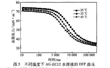 由圖5可知,當溫度升高,DST下降的速率明顯加快。這是因為分子的不規(guī)則運動更加激烈,使得分子間的引力減小。表面張力越早開始下降,在各個階段的表面張力值就越低。在45℃下開始測量時,表面張力已經(jīng)降到了70mN/m左右,這也許是由于溫度升高降低了純?nèi)軇┧谋砻鎻埩?。升高溫度,表面張力下降的更快,更易達到第四個階段平衡狀態(tài)。這說明了高溫下其動態(tài)表面活性更好。可能是由于表面活化能在高溫時更低,使得AG.EC分子更易在溶液表面吸附。