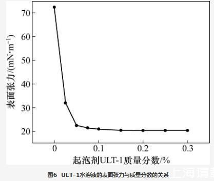當(dāng)起泡條件相同時,起泡劑水溶液的表面張力越低,發(fā)泡體積越高。配制一系列濃度梯度的起泡劑ULT-1水溶液,利用接觸角/表面張力測量儀采用懸滴法測量表面張力與起泡劑ULT-1質(zhì)量分?jǐn)?shù)的關(guān)系,結(jié)果如圖6所示。從圖6可知:當(dāng)起泡劑ULT-1質(zhì)量分?jǐn)?shù)小于0.05%時,表面張力隨起泡劑ULT-1質(zhì)量分?jǐn)?shù)的提高快速降低;當(dāng)起泡劑ULT-1質(zhì)量分?jǐn)?shù)大于0.05%時,表面張力降幅越來越?。划?dāng)起泡劑ULT-1質(zhì)量分?jǐn)?shù)提高至0.2%時,表面張力降至20.40 mN/m,較蒸餾水降低了71.82%,繼續(xù)提高起泡劑ULT-1的質(zhì)量分?jǐn)?shù),表面張力不再降低。表明新型起泡劑ULT-1在較低濃度時即達(dá)到較低的表面張力,有利于提高發(fā)泡體積。