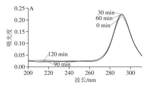 鹽酸胍誘導(dǎo)肌漿蛋白變性的熒光光譜如圖1A~C所示,3種肌漿蛋白都在290 nm波長(zhǎng)處達(dá)到最大吸光度,由于酪氨酸主要對(duì)250~290 nm波長(zhǎng)范圍內(nèi)具有吸收。由肌漿蛋白氨基酸組成可知,雞肉肌漿蛋白的酪氨酸含量最高,這也解釋了在第0分鐘時(shí)雞肉肌漿蛋白的吸光度相比較而言達(dá)到最大。而且豬肉和魚肉肌漿蛋白在第120分鐘時(shí)達(dá)到最大吸光度,這說明肌漿蛋白三級(jí)結(jié)構(gòu)改變時(shí),構(gòu)象發(fā)生重排且構(gòu)象展開,而雞肉肌漿蛋白在第120分鐘時(shí)吸光度有所下降,說明雞肉肌漿蛋白結(jié)構(gòu)改變較快。由圖1D可知,隨著時(shí)間的延長(zhǎng),構(gòu)象變化速率越來越小,并且在相同時(shí)間下,豬肉肌漿蛋白與雞肉肌漿蛋白的峰值變化速率無顯著差異(P>0.05),而魚肉肌漿蛋白峰值變化速率相比較而言顯著較慢(P<0.05)。這一結(jié)果表明,和魚肉肌漿蛋白相比,豬肉和雞肉的肌漿蛋白構(gòu)象柔順性更好。