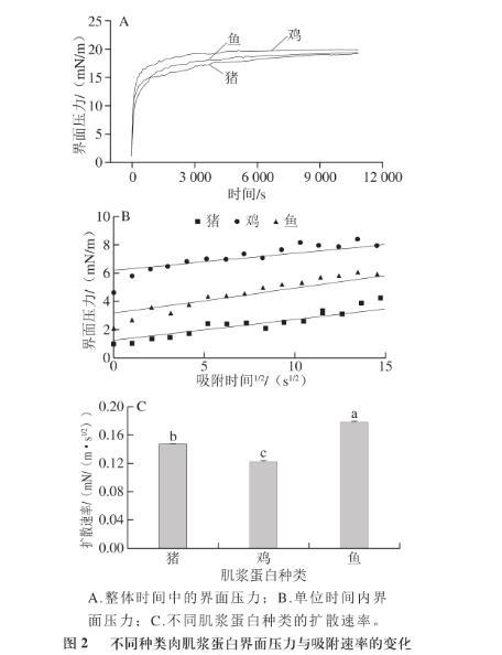 由圖2可知,不同種類肌漿蛋白的動(dòng)力學(xué)擴(kuò)散速率間存在差異性。蛋白質(zhì)分子在界面上的擴(kuò)散速率受其粒徑大小的影響,而本實(shí)驗(yàn)結(jié)果更能解釋這一現(xiàn)象。在前述理化指標(biāo)中,粒徑大小為雞肉肌漿蛋白>豬肉肌漿蛋白>魚肉肌漿蛋白,而在本部分?jǐn)U散速率大小為雞肉肌漿蛋白<豬肉肌漿蛋白<魚肉肌漿蛋白。這可能是由于大粒徑的肌漿蛋白產(chǎn)生的空間位阻在一定程度上削弱了表面疏水性提高帶來的吸附速率增加。而且魚肉肌漿蛋白的擴(kuò)散速率較豬肉和雞肉肌漿蛋白間顯著較大(P<0.05),但雞肉與豬肉肌漿蛋白之間的擴(kuò)散速率卻無顯著性差異(P>0.05)。