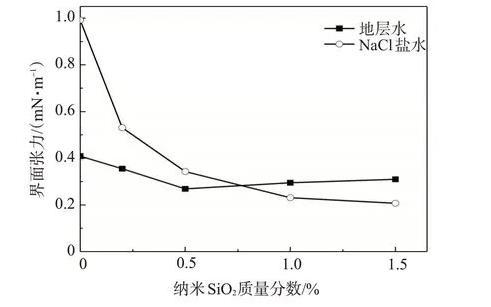 在NaCl鹽水中,納米SiO2/SDS體系的|ζ|基本大于30 mV,體系更易穩(wěn)定;模擬地層水中二價(jià)陽(yáng)離子的存在使得體系的|ζ|均小于30 mV,顆粒容易聚集沉淀。納米SiO2含量越大,顆粒之間碰撞的機(jī)率增加,納米SiO2/SDS體系的穩(wěn)定性越差。隨著納米SiO2含量的增加,SDS降低油水界面張力的能力在NaCl鹽水中逐漸增強(qiáng),而在模擬地層水中先增后減,在SiO2質(zhì)量分?jǐn)?shù)為0.5%時(shí)界面張力達(dá)到最低。