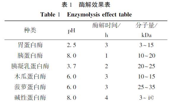 為實(shí)現(xiàn)膠原蛋白肽分子量可控均一,分別比較了胃蛋白酶、胰蛋白酶、胰凝乳蛋白酶、木瓜蛋白酶、菠蘿蛋白酶、堿性蛋白酶的酶解效果,在酶本身最適pH條件下,酶解至分子量不發(fā)生明顯變化,檢測其酶解后分子量分布(分子量計(jì)算依據(jù)圖1中的標(biāo)準(zhǔn)曲線),結(jié)果見表1。從表中結(jié)果可以看出不同的酶對膠原蛋白的酶解效果不盡相同,然而均未能達(dá)到控制其分子量在200~5 000 Da的預(yù)期效果。胰蛋白酶酶解速度最快,1 h酶解結(jié)束,而堿性蛋白酶是這幾種蛋白酶中酶解后分子量最小的。因此,將這2種最適pH為8.0的蛋白酶混合,經(jīng)條件優(yōu)化發(fā)現(xiàn)胰蛋白酶。堿性蛋白酶為2:5時(shí),2種酶同時(shí)作用可以在1 h內(nèi)將膠原蛋白酶解至200~5 000 Da(凝膠過濾色譜檢測結(jié)果見圖2)。堿性蛋白酶酶切位點(diǎn)為Ala、Leu、Val、Tyr、Phe、Try,胰蛋白酶酶切位點(diǎn)為Arg、Lys,這2種酶的酶切位點(diǎn)無重疊,從而在酶解過程中協(xié)同作用,實(shí)現(xiàn)了快速高效酶解。