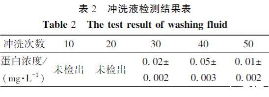 通過用生理鹽水對材料進(jìn)行浸泡、多次沖洗,檢測覆層4層羥基磷灰石材料中膠原蛋白肽的泄露,來評價(jià)生物覆層材料的穩(wěn)定性。對收集的浸泡液、沖洗液濃縮100倍,通過微量Lowry法檢測其蛋白濃度,在浸泡液中未檢出膠原蛋白肽,沖洗液檢測結(jié)果見表2。從表中結(jié)果可以看出隨著沖洗次數(shù)增多,泄露的膠原蛋白肽呈現(xiàn)先增加后減少的趨勢,說明覆層的膠原蛋白肽會有一定的脫落,但不會一直脫落,經(jīng)折算,脫落膠原蛋白肽總量僅占覆層總量的0.01%,因此制備的覆層材料是穩(wěn)定可靠的。
