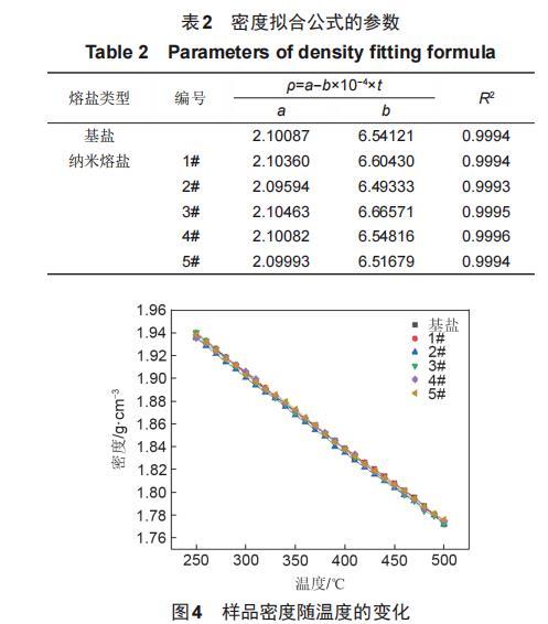 利用阿基米德法對(duì)基鹽及5種加入30 nm SiO2納米顆粒的納米熔鹽的密度進(jìn)行測(cè)量,每隔10℃進(jìn)行一次測(cè)量,對(duì)得到的實(shí)驗(yàn)數(shù)據(jù)進(jìn)行整理和分析,擬合公式以及擬合系數(shù)見表2。樣品的密度隨溫度變化如圖4所示。