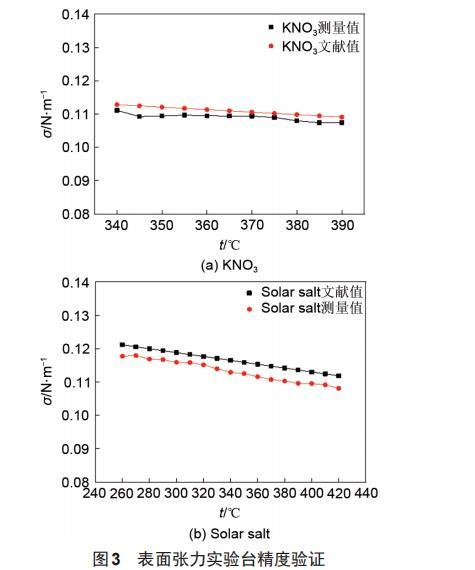 本實(shí)驗(yàn)先對(duì)NaNO3的表面張力進(jìn)行測(cè)量,得到儀器系數(shù)C。由式(4)可知,儀器系數(shù)C與溫度無(wú)關(guān),對(duì)NaNO3在5個(gè)溫度工況點(diǎn)下的表面張力進(jìn)行測(cè)量,并且每個(gè)溫度工況點(diǎn)采集3次測(cè)實(shí)驗(yàn)數(shù)據(jù),通過(guò)最終的計(jì)算得到本實(shí)驗(yàn)臺(tái)的儀器系數(shù)C=0.00053。對(duì)KNO和solar salt的表面張力進(jìn)行測(cè)量后,與文獻(xiàn)值進(jìn)行對(duì)比,如圖3所示。