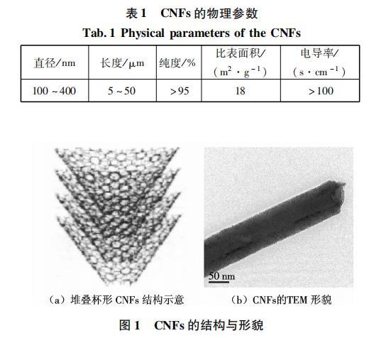 納米碳纖維(carbon nanofibers,CNFs)是近十年興起的一種新型亞微米增強(qiáng)纖維材料,它是化學(xué)氣相生長碳纖維的一種形式,一般通過裂解氣相碳?xì)浠衔镏苽洌菢?gòu)成以碳黑、富勒烯、單壁和多壁碳納米管為一端,以連續(xù)碳纖維為另一端鏈節(jié)中的一環(huán).CNFs的直徑一般在150~400nm之間,與碳納米管(CNTs)相比,CNFs的制備更易于實現(xiàn)工業(yè)化生產(chǎn).CNFs有著優(yōu)異的物理性能、力學(xué)性能和化學(xué)性能.研究表明,CNFs的抗拉強(qiáng)度可以達(dá)到2~5 GPa,平均彈性模量為300 GPa.除具有普通氣相生長碳纖維的特性,如低密度、高比模量、高比強(qiáng)度、高導(dǎo)電性等性能外,CNFs還具有缺陷數(shù)量少、比表面積大、結(jié)構(gòu)致密等優(yōu)點,這使得CNFs在納米復(fù)合材料領(lǐng)域得到了廣泛的應(yīng)用.然而,納米復(fù)合材料的性能往往會受到兩個主要因素的影響,一個是納米材料在基體材料中的分散程度,另一個是納米材料表面與基體材料之間的黏結(jié)強(qiáng)度和能量.由于受到范德華力的的影響,CNFs彼此吸引并相互纏結(jié)在一起,懸浮于水的表面,幾乎無法均勻溶解,這大大制約了CNFs在復(fù)合材料中的應(yīng)用.如何解決CNFs在水性體系中的分散已成為研究者廣泛關(guān)注的熱點.