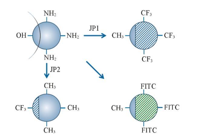將具有APS和OTS的SiO?顆粒分散在2.4×10?2 mol/L PFOA的甲苯溶液中并攪拌48 h。通過(guò)蒸發(fā)除去溶劑,再多次離心洗滌,然后在110℃下退火2 h,將所制得的顆粒命名為JP1,制備過(guò)程如Scheme 1所示。