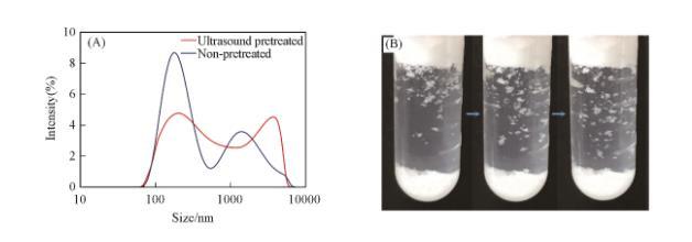 值得注意的是,如果粒子首先用超聲波分散在液體中,然后以相同的方式振蕩,則顆粒產(chǎn)生的泡沫高度有所下降[圖6(A)]。因此對比了振蕩和超聲波處理后的顆粒在液體中團(tuán)聚體的粒徑大小。采用動態(tài)光散射儀間接表征了顆粒在液體中的團(tuán)聚情況[圖7(A)]??梢钥闯觯袷幒蟮囊后w中有較多物質(zhì)的粒徑大于單個顆粒直徑,而且粒徑分布很寬。這證明液體中存在明顯的顆粒團(tuán)聚體。由于顆粒本身存在巨大的表面能,多數(shù)顆粒在空氣中已經(jīng)自發(fā)團(tuán)聚。顆粒在液體中大多也以團(tuán)聚體的方式存在。少量空氣被密封在浸沒于油相中的顆粒團(tuán)聚體內(nèi)部,這部分不與外界聯(lián)通的空氣提供了額外的壓力,進(jìn)而阻止了進(jìn)一步滲透。這種顆粒團(tuán)聚體表面同樣形成了由Cassie-Baxter方程描述的復(fù)合表面,該復(fù)合表面的形成保護(hù)了構(gòu)成團(tuán)聚體的顆粒不被完全潤濕,并使團(tuán)聚體表面具有合理的疏油性(cosθ_CB的值接近0),從而在熱力學(xué)上團(tuán)聚體便于發(fā)生吸附。而溶液經(jīng)超聲波處理后顆粒被潤濕,團(tuán)聚體被破壞使尺寸變小,并且均勻分布在溶液中。圖6(B)顯示了在經(jīng)超聲波處理后的表面張力測試數(shù)據(jù),同樣表明團(tuán)聚體被破壞后,被潤濕的顆粒不再傾向于吸附在表面上。
