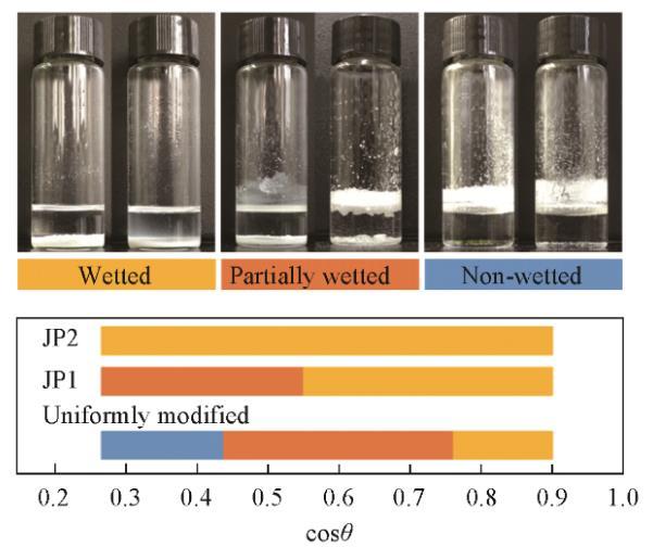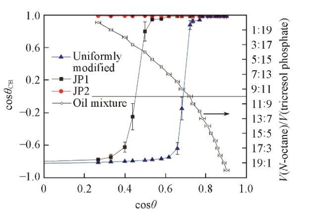 放置在靜止液體表面的顆粒的潤濕行為由圖5示出。隨著液體表面張力的增加,從光滑的氟碳鏈覆蓋的表面獲得的cosθ值同時增大,液體頂部的表面出現(xiàn)明顯的不溶顆粒。這種顆粒不潤濕的情況與顆粒形成粗糙表面測量的結(jié)果具有相關(guān)性。干燥的顆粒以蓬松狀態(tài)直接向油相傾倒,如果在油相表面能形成足夠強(qiáng)壯的、由顆粒組成的亞穩(wěn)態(tài)Cassie-Baxter狀態(tài),那么疏油表面將會形成,并阻止其它顆粒接觸油相,宏觀表現(xiàn)為顆粒不潤濕。相反,如果油相表面由顆粒組成的亞穩(wěn)態(tài)Cassie-Baxter狀態(tài)魯棒性不足,在手動振蕩或重力作用下,顆?;蝾w粒團(tuán)聚體接觸油相并浸沒在油相中。亞穩(wěn)態(tài)魯棒性與顆粒表面材料潤濕角密切相關(guān),即不同類型的顆粒具有明顯不同的潤濕轉(zhuǎn)折點(diǎn)。JP1潤濕性轉(zhuǎn)折點(diǎn)位于均勻修飾顆粒右側(cè),JP2沒有發(fā)現(xiàn)潤濕轉(zhuǎn)折點(diǎn)。這與顆粒上接枝的烷烴鏈數(shù)量有關(guān)。JP2上盡管存在氟碳鏈,但由于烷烴鏈覆蓋的面積太大,使顆粒整體表現(xiàn)出強(qiáng)烈的親油性。