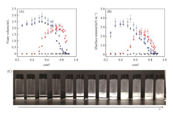 在油相中有無顆粒條件下的表面張力差如圖6(B)所示。顆粒吸附在表面上會導(dǎo)致表面張力下降。無論均勻修飾顆粒還是Janus顆粒,表面張力的下降程度和泡沫體積有一個最大值。表面張力下降程度的最大值出現(xiàn)時,cosθ大于0.39(θ < 70.1°),而泡沫體積的最大值出現(xiàn)時,cosθ大于0.49(θ < 67.0°)。許多研究人員得到的關(guān)于顆粒穩(wěn)定的泡沫的結(jié)論為:顆粒接觸角等于90°時泡沫最穩(wěn)定。值得注意的是,在這一結(jié)論中,默認(rèn)顆粒是以單一的、獨(dú)立的形式向界面吸附。如果基于這些理論,在單個顆粒的接觸角接近90°時,表面張力的下降程度應(yīng)該最大,這與本文研究結(jié)果不符。結(jié)合圖4可見,在粗糙表面的親油-疏油狀態(tài)發(fā)生轉(zhuǎn)變(即cosθ_CB跨越0點(diǎn))的cosθ值附近,表面張力下降幅度最大。這對應(yīng)著顆粒是否向表面吸附與顆粒構(gòu)成的粗糙表面的接觸角θ_CB相關(guān),而不是單個顆粒表面的接觸角θ,為此本文開展了進(jìn)一步研究。