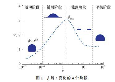 根據(jù)β隨τ變化情況,液滴碰撞分為運動、鋪展、弛豫和平衡4個階段,如圖1所示。在運動階段(τ<0.1),慣性力占主導(dǎo)地位,液滴上部仍保持球狀,下部鋪展成楔形邊緣,文指出該階段可忽略流體性質(zhì)影響,β隨τ呈指數(shù)上升,即β∝τb,其中指數(shù)b介于0.45到0.57之間,一般取b=0.5;在鋪展階段,受黏性力或毛細(xì)力的主導(dǎo)作用,β逐漸增至βmax,然后液滴開始回撤收縮,進(jìn)入馳豫階段;在平衡階段,液滴可能穩(wěn)定鋪展,也可能發(fā)生反彈,或者碎裂飛濺。本文主要針對運動階段和鋪展階段進(jìn)行研究。