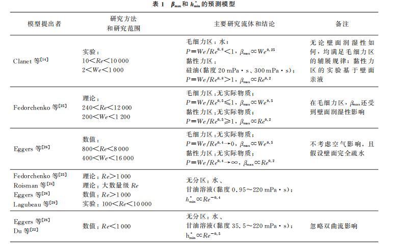 βmax和hmin*的多種預(yù)測模型如表1所示。從表1可以看出,在黏性力區(qū),已有的理論、實驗和模擬研究普遍認(rèn)為βmax主要由Re控制,與Re0.2成正比,但目前實驗數(shù)據(jù)和模擬驗證均較少,已有實驗主要針對硅油、甘油溶液,黏度在300 mPa·s以內(nèi),缺乏對于更高黏度液體的研究;另外,Eggers等的模擬研究不針對真實流體,且忽略空氣影響和假設(shè)壁面完全疏水,與現(xiàn)實情況具有差異。在毛細(xì)力區(qū),盡管Eggers等的模擬結(jié)果與Fedorchenko等的理論相符合,都認(rèn)為βmax∝We0.5,但Clanet等的實驗結(jié)果卻表明βmax∝We0.25,實驗所得We指數(shù)大小僅為理論的一半。因此,仍需對βmax進(jìn)行更多的實驗、模擬研究。