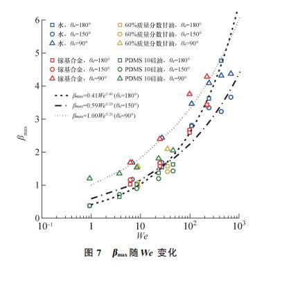 本文在毛細(xì)力區(qū)研究的流體包括水、60%質(zhì)量分?jǐn)?shù)甘油溶液、PDMS10硅油和鎵基合金,βmax隨We變化的情況如圖7所示。對不同潤濕性壁面的模擬結(jié)果進(jìn)行擬合,如圖7中虛線所示:當(dāng)θe=90°時(shí),βmax∝We0.26(R2=0.921);當(dāng)θe=180°時(shí),βmax∝We0.40(R2=0.990);當(dāng)θe=150°時(shí),βmax∝We0.29(R2=0.918),介于前兩者之間。因?yàn)檎鎸?shí)表面無法絕對疏水,所以Clanet等實(shí)驗(yàn)研究結(jié)果βmax∝We0.25更接近本文θe=90°的模擬結(jié)果,而Eggers等針對完全疏水表面提出的βmax∝We0.5更適用于θe=180°的情況。