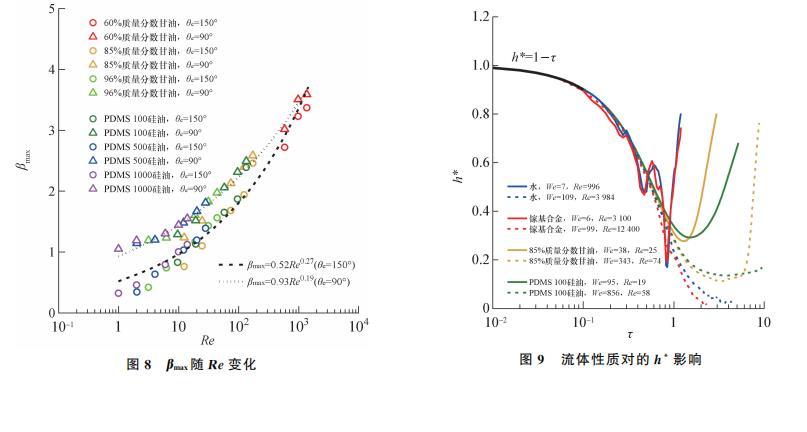 4)對于以往鮮有研究的高黏度PDMS1000硅油和超高表面張力的鎵基合金,盡管這2種流體物性較為特殊,但其碰撞過程仍主要受Re和We影響。但當(dāng)PDMS1000硅油以低速碰撞壁面時(shí),Re接近于1,此時(shí)液滴的入射動(dòng)能很快通過黏性力耗散殆盡,慣性力作用可忽略不計(jì),液滴在壁面上近似于自發(fā)鋪展,導(dǎo)致βmax和hmin*主要由液滴初始動(dòng)能和壁面潤濕性決定,偏離結(jié)論2和3中與We、Re之間的冪函數(shù)關(guān)系。