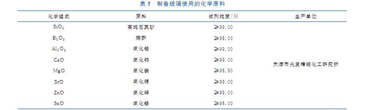 實(shí)驗(yàn)所用的玻璃原料包括石英砂、氧化鋁、硼酐(氧化硼)、氧化鈣、氧化鎂、氧化鍶、氧化鋅,化學(xué)澄清劑所用原料為氧化亞錫,試劑純度等級均為分析純(AR),實(shí)驗(yàn)設(shè)計(jì)引入成分及使用的原料種類、具體純度如表5所示,所有化學(xué)成分均以氧化物原料的形式引入,玻璃成分中除原料可能含有的部分雜質(zhì)以外,均不含任何人為引入的其他成分。