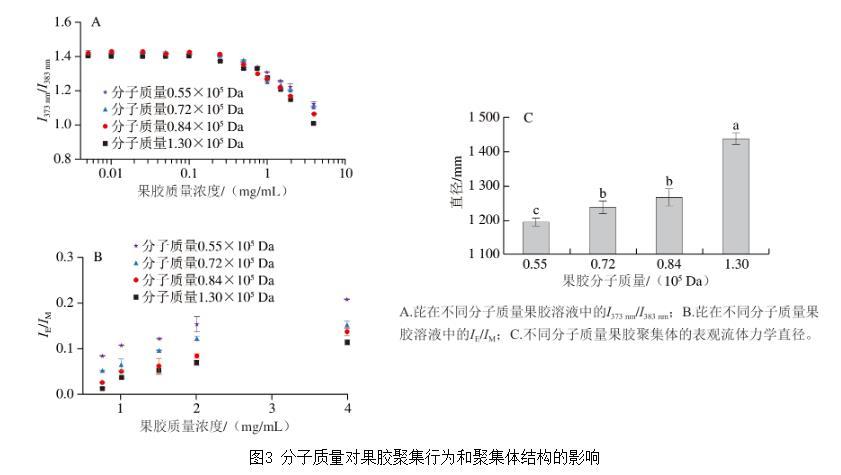 如圖3B所示,在任意高于臨界聚集濃度的條件下,芘的IE/IM隨果膠分子質(zhì)量的增加呈現(xiàn)規(guī)律性降低。這與果膠形成聚集體內(nèi)的疏水微區(qū)結(jié)構(gòu)有關(guān)。雖然高分子質(zhì)量果膠形成的聚集體具有極性更低、對(duì)芘溶解度更高的疏水微區(qū),但由于疏水微區(qū)尺寸較大,降低了芘分子間的接觸概率,從而減少了芘二聚體的生成,最終表現(xiàn)為較低的IE/IM。