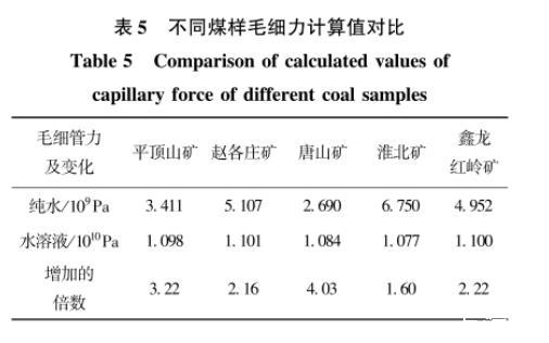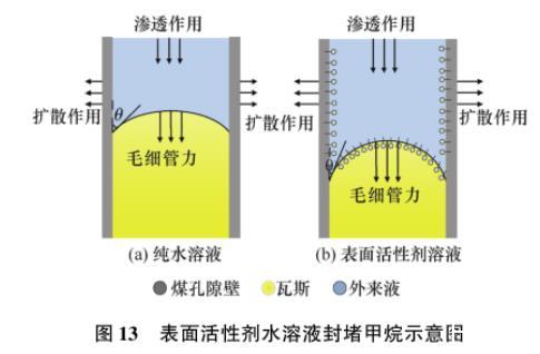 毛細(xì)管力與溶液表面張力成正比、與孔隙半徑成反比;同時,接觸角越小,毛細(xì)管力越大。由表5可知,朱鍇[21]試驗并計算煤樣10 nm孔徑的毛細(xì)力,發(fā)現(xiàn)自配的表面活性劑水溶液能夠使毛細(xì)力平均提高2倍,最大提高4.03倍。如圖13所示,在擴散、滲透和毛細(xì)力共同作用下,表面活性劑水溶液沿著煤體表面、孔隙和裂隙進入煤體內(nèi)部產(chǎn)生液相滯留效應(yīng),增大煤潤濕效果的同時其內(nèi)部瓦斯流動阻力變大,孔隙內(nèi)瓦斯氣體被水溶液封堵。因此,添加活性劑水溶液能夠減小水溶液的表面張力、降低水溶液與煤之間的接觸角,增強煤的潤濕效果,達到抑制煤層瓦斯的解吸、延緩采動煤巖體中瓦斯逸散的目的,從而降低開采工作面瞬時瓦斯涌出量。也有學(xué)者[21,29,32]分析認(rèn)為,添加表面活性劑水溶液會降低煤體溫度、增強煤吸附瓦斯的能力,使得部分游離態(tài)瓦斯轉(zhuǎn)變?yōu)槲綉B(tài),相應(yīng)地減少了瓦斯氣體的逸散涌出。