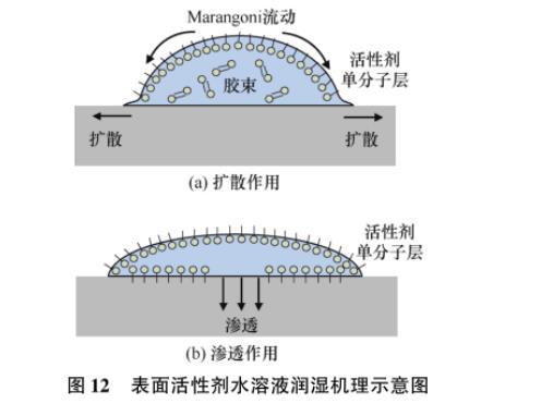 如圖12(a)所示,表面活性劑分子在氣-液界面的吸附行為影響著溶液的擴散。表面活性劑分子自發(fā)地從溶液內(nèi)部遷移至表面,其尾部憎水基會以伸出的方式在溶液表面形成活性劑單分子層,使水溶液的表面張力下降。由于在一相或兩相中,一個或多個組分在此局域(界面)的濃度與本體相中的濃度不同,所產(chǎn)生的張力梯度會引起界面上的質(zhì)量傳遞即Marangoni流動效應(yīng),進而會導(dǎo)致液滴前沿不斷擴散[42-43],在擴散作用下進一步促使液體與固體之間的接觸面積增大,從而降低接觸角。