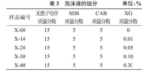 表3為泡沫溶液的配方。根據(jù)三元復(fù)配體系的發(fā)泡性能,選取發(fā)泡性能最佳的9號(hào)組,無患子皂苷、SDS、CAB質(zhì)量分?jǐn)?shù)固定在15%、5%、5%。研究XG濃度變化對(duì)泡沫溶液性能的影響。