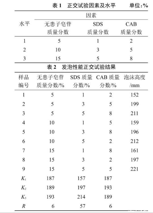 根據(jù)正交表測(cè)定其發(fā)泡高度,結(jié)果見表2。表2中K1、K2、K3表示各因素在相應(yīng)水平下評(píng)價(jià)指標(biāo)的平均值,R為各因素相應(yīng)水平下評(píng)價(jià)指標(biāo)的級(jí)差。發(fā)泡高度的極差R值表明,各因素的重要性依次為SDS>CAB=無患子皂苷,SDS對(duì)復(fù)配體系的發(fā)泡性能影響最大。由表2中發(fā)泡高度的K值可見,發(fā)泡性能最佳的組合是第9組。表面活性劑復(fù)配后隨著其添加量的增加,空氣與液膜之間的活性劑分子濃度增加,有利于提高泡沫溶液的發(fā)泡能力[9]。