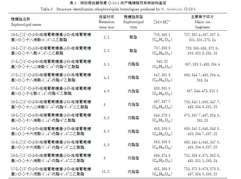 表3球擬假絲酵母菌O-13-1所產(chǎn)槐糖脂同系物結(jié)構(gòu)鑒定