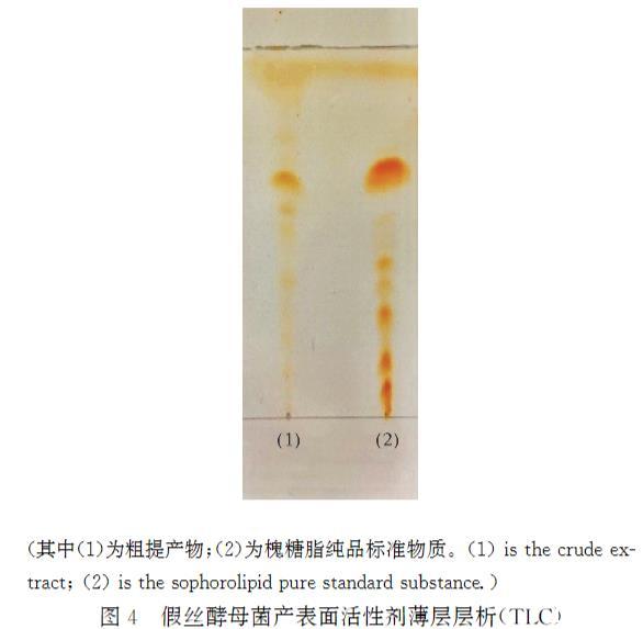 圖4假絲酵母菌產(chǎn)表面活性劑薄層層析(TLC)其中(1)為粗提產(chǎn)物;(2)為槐糖脂純品標(biāo)準(zhǔn)物質(zhì)。