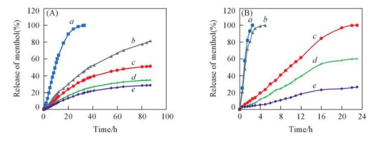 白家峰等采用聚多巴胺(PDA)修飾的介孔二氧化硅微球負(fù)載L-薄荷醇,發(fā)現(xiàn)PDA涂層有利于薄荷醇的可控緩慢釋放,在30℃空氣吹掃作用下,負(fù)載樣品中的薄荷醇在25 h后幾乎釋放完全;而在80℃空氣吹掃作用下,負(fù)載樣品中的薄荷醇在100 min后接近完全釋放。可見,本研究制得的負(fù)載體系具有較優(yōu)的長效緩釋性能。