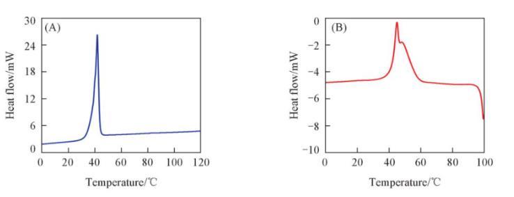 圖6(A)和(B)分別為空白樣品與負(fù)載型樣品的示差掃描量熱(DSC)曲線。從圖6(A)可以看出,L-薄荷醇樣品在大約42℃左右出現(xiàn)一個(gè)尖銳的吸熱峰,對應(yīng)于L-薄荷醇的熔點(diǎn)。而負(fù)載型樣品則出現(xiàn)了兩個(gè)吸熱峰[圖6(B)],其中第一個(gè)峰主要是由生長在DA-GQD外表面的薄荷醇小晶體融化引起的,而第二個(gè)峰主要是由DA-GQD包覆的薄荷醇小晶體融化引起的。這與劉紹華等的研究結(jié)果相類似。