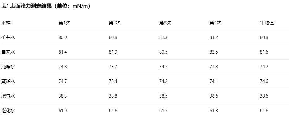 采用芬蘭Kibron公司生產(chǎn)的Delta-8全自動高通量表面張力儀對不同種類的水在室溫下進行測定,鉑金環(huán)浸入到水中一定的位置,隨著鉑金環(huán)與水之間的膜被拉長,使鉑金環(huán)受到一個向下的力,差動變壓器的磁芯隨鉑金環(huán)的下降而上升,使差動變壓器的線圈感應(yīng)出一定的電壓值,這樣將被拉伸的薄膜變形量轉(zhuǎn)化為電壓量,經(jīng)微機處理轉(zhuǎn)化為相應(yīng)的張力值,并自動顯示出來。隨薄膜逐漸被拉長,張力值逐漸增大,直至薄膜破裂,記下的最大值即水的實時張力。
