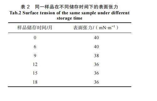 在溫度為23℃、相對濕度為60%的環(huán)境下,測試樣品在不同儲存時間下的表面張力,測得數(shù)據(jù)見表2。由表2可知,樣品轉(zhuǎn)移涂層剛開始成膜時的表面張力為40 mN/m,且樣品儲存6個月以內(nèi)的表面張力基本保持不變。7—9個月出現(xiàn)衰退,降低為38 mN/m,符合真空噴鋁紙行業(yè)標準(BB/T 0054—2010)。儲存12個月至18個月的紙樣表面張力僅為36 mN/m,但并未在儲存18個月時出現(xiàn)進一步的明顯降低。顯然,紙樣的表面張力緩慢降低并不能解釋2.1節(jié)中出現(xiàn)的18個月印刷油墨與轉(zhuǎn)移涂層的附著力差的問題。再根據(jù)相關(guān)研究,表面張力≥38 mN/m的要求,并不直接適用于轉(zhuǎn)移紙印刷的質(zhì)量控制,特別是用于UV膠印的真空噴鋁轉(zhuǎn)移紙的轉(zhuǎn)移涂層。膠印印刷適應性并不完全由表面張力所決定。