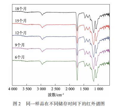 為了探究表面轉(zhuǎn)移涂層是否發(fā)生了結(jié)構(gòu)變化,對不同儲存時間下的樣品進行紅外光譜測試分析,見圖2??梢钥闯?,儲存時間為6—18個月的樣品的紅外譜圖并未發(fā)生明顯變化。譜圖的一致性證明了噴鋁紙表面轉(zhuǎn)移涂層的基本結(jié)構(gòu)并未隨著時間發(fā)生明顯變化,即掉墨現(xiàn)象的出現(xiàn)并非由于轉(zhuǎn)移涂層出現(xiàn)結(jié)構(gòu)變化導致。根據(jù)相關(guān)研究,噴鋁紙在儲存的時候,紙張及涂層中添加的助劑,環(huán)境介質(zhì)中的水分子、油污和空氣等小分子物質(zhì)會通過吸附、擴散、遷移和凝集等作用,甚至鍵合等途徑,在轉(zhuǎn)移涂層表面形成低分子物質(zhì)的富集區(qū),即弱界面層,降低了轉(zhuǎn)移涂層的表面張力,并使其印刷適性變差。