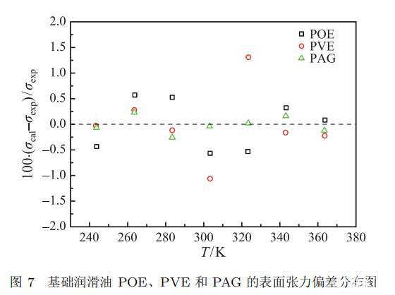式中,T 是溫度,K;σ 是表面張力,mN·m?1;a、b 和 c 為關(guān)聯(lián)方程的擬合參數(shù)。基礎(chǔ)潤滑油 POE、PVE 和 PAG 的參數(shù)關(guān)聯(lián)值和絕對平均偏差列于表 4 中,其實驗數(shù)據(jù)與關(guān)聯(lián)方程的絕對平均偏差分別為 0.43%、0.45% 和 0.13%;三種基礎(chǔ)潤滑油的相對偏差分布如圖 7 所示,其實驗測量結(jié)果的相對偏差均在 ±1.5% 以內(nèi),表明實驗結(jié)果與關(guān)聯(lián)方程的吻合良好。