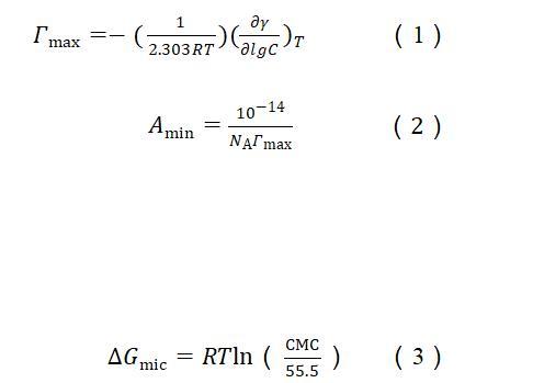 根據(jù)表面張力和濃度的關系曲線,使用吉布斯吸附等溫線〔方程(1)〕計算出表面活性劑分子吸附在氣液界面的最大表面過剩濃度(Гmax)。