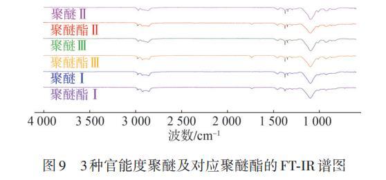 圖9為3種官能度的聚醚和聚醚酯FT-IR譜圖。由圖9可以看出,在3種官能度聚醚的FT-IR譜圖中,1 737 cm?1處均無特征峰,而3種官能度聚醚酯在1 737 cm?1處均有特征峰,為酯基C==O的吸收峰,說明3種官能度聚醚末端的醇羥基已經(jīng)與脂肪酸發(fā)生反應。2 971 cm?1處的特征峰表明有—CH?存在,2 857和1 455 cm?1處的特征峰表明存在—CH?—,1 296 cm?1處的特征峰則為—CH?的彎曲振動峰,在1 097 cm?1處的C—O—C伸縮振動峰較明顯,表明聚醚酯中醚鍵較多。