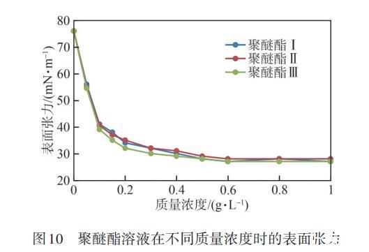 在室溫下,將聚醚酯配制成不同質(zhì)量濃度的水溶液,測試其表面張力,結(jié)果見圖10。由圖10可知,聚醚酯溶液的表面張力隨其質(zhì)量濃度的增高而下降,當聚醚酯溶液的質(zhì)量濃度為0~0.2 g/L時,聚醚酯溶液的表面張力下降較快,當聚醚酯溶液的質(zhì)量濃度大于0.2 g/L時,聚醚酯溶液的表面張力隨其質(zhì)量濃度的增加而下降較慢,3種官能度聚醚酯的表面張力下降趨勢基本一致,當聚醚酯溶液的質(zhì)量濃度提高到0.6 g/L時,3種聚醚酯溶液的表面張力均降至27.0 mN/m,說明聚醚酯在較低的質(zhì)量濃度下可以快速降低表面張力,表面性能優(yōu)異。