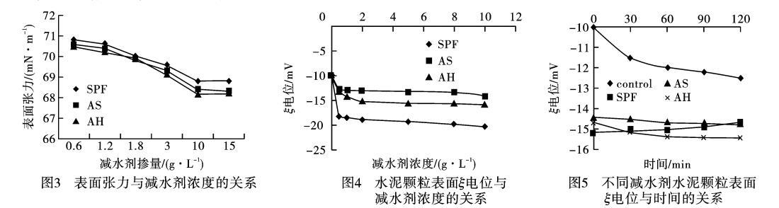 從圖3可知,SPF、AS和AH3種高效減水劑溶液的表面張力隨著高效減水劑濃度的增大而減小,SPF減水劑能降低水的表面張力,但沒有AS、AH降低得多,其主要原因是AS、AH在氣液界面的取向能力大且對混凝土有一定的引氣作用,而SPF不能明顯降低溶液表面張力,其對水泥顆粒分散作用中濕潤作用貢獻(xiàn)較小。