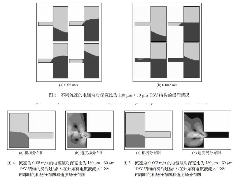 TSV深寬比設(shè)置為130μm:30μm,電鍍液流人速度為0.05 m/s和0.002 m/s的浸潤仿真結(jié)果分別如圖3所示,前者在TSV底部形成氣泡,后者可以完全浸潤。模擬結(jié)果表明降低電鍍液流入速度有利于浸潤。通過仿真中兩種情況下浸潤過程中的流速場對比,可以看出在電鍍液流入的過程中,電鍍液流人速度較大時(shí),如圖4(b)所示,電鍍液表面距離TSV較遠(yuǎn)的部分有著相對更大的流速,即電鍍液流過TSV上方的速度大于電鍍液向TSV內(nèi)部流入的速度,導(dǎo)致在電鍍液流過TSV上方時(shí),其流入TSV內(nèi)部的分流量還沒有充滿TSV內(nèi)部排出其中氣體之前,電鍍液就已經(jīng)流過了TSV上方,并將TSV口部封死,導(dǎo)致內(nèi)部殘留氣體無法排出,形成不完全浸潤;而當(dāng)電鍍液流入速度較小時(shí),如圖5(b)所示,電鍍液表面在TSV口部附近具有相對更大的流速,即電鍍液向TSV內(nèi)部流入的速度大于其流過TSV上方的速度,使得電鍍液流過TSV上方時(shí),有足夠的分流量流入TSV內(nèi)部,將其中氣體排出并將TSV填滿,實(shí)現(xiàn)完全的浸潤。