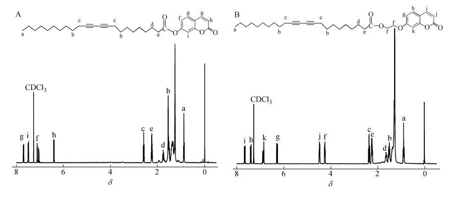 2類香豆素取代二乙炔單體參照文獻所述方法合成,分子結(jié)構(gòu)及產(chǎn)物核磁譜圖如圖1所示。將2種產(chǎn)物分別溶于氯仿,配成1mg/mL的溶液。亞相為超純水(18.2MΩ·cm)。所有的π-A曲線和LB膜拉制實驗均為20℃條件下在KSV Mini-trough LB膜儀上進行。溶劑充分揮發(fā)后,膜障以5 mm/min的速率對其壓縮,在20℃和恒定膜壓35 mN/m下以2mm/min速率沉積Y-型LB膜?;瑸槭⑵?。薄膜的聚合是在16W的紫外燈(波長254nm)輻照下完成的,薄膜表面距離燈管下緣10cm,輻照時間5min。