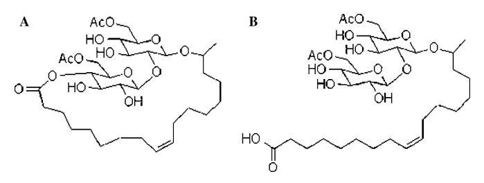 通常,槐糖的60-和600-羥基被乙?;舅徭滈L度在16到18個(gè)碳之間變化(一個(gè)例外是由R.bogoriensis合成的SLs,其中包括22和24個(gè)碳的脂肪酸側(cè)鏈;Nun?ez et al.2004); 并且可能是飽和的或不飽和的。 此外,SLs的優(yōu)選結(jié)構(gòu)構(gòu)象為內(nèi)酯,其中脂肪酸的羧基在碳400處酯化為二糖環(huán),盡管在某些情況下,SLs的脂肪酸可能保持游離酸、開鏈形式。