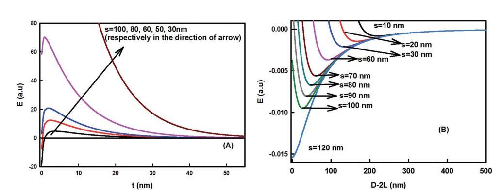 圖6足跡直徑對(duì)粘粒組件的影響。(A) 作為界面區(qū)域厚度函數(shù)的能量變化(L?60 nm,T?298 K,f?0.5,姜黃素納米顆粒半徑R?50 nm,疏水衰減長度x0?1 nm,界面張力?40 mN m-1)。(B) 粘粒–粘粒相互作用作為粒間分離D的函數(shù),使用方程(5)計(jì)算。對(duì)于更大的封裝外形直徑,能量最小值變得更深,對(duì)于大于100 nm的s,能量最小值變得更有吸引力。
