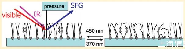 在此,我們研究了光開關(guān)脂質(zhì)DT Azo-5P(圖1)的單層,其為純的,并與脂質(zhì)1,2-二棕櫚酰-sn-甘油-3-磷酸膽堿(DPPC)混合。如圖1中的UV/vis光譜所示,光活性脂質(zhì)可分別用370和450 nm的光從其反式狀態(tài)切換到順式狀態(tài)并返回。我們將表面壓力測(cè)量與無標(biāo)簽、寬帶振動(dòng)和頻率產(chǎn)生(VSFG)光譜相結(jié)合。10這些技術(shù)使我們能夠研究空氣-水界面上的脂質(zhì)分子單層。可以獲得有關(guān)脂質(zhì)與水分子相互作用的信息以及脂質(zhì)的分子結(jié)構(gòu)。在非線性光學(xué)技術(shù)VSFG中,紅外(IR)光束和可見光(VIS)光束在界面處組合,產(chǎn)生具有兩個(gè)入射光束和頻率的信號(hào)。如果紅外線與分子振動(dòng)共振,信號(hào)就會(huì)強(qiáng)烈增強(qiáng)。已經(jīng)證明,這種通過分子振動(dòng)的技術(shù)提供了有關(guān)脂質(zhì)分子構(gòu)象和取向的信息。11-18在中心對(duì)稱介質(zhì)中禁止和頻產(chǎn)生,因?yàn)檫@是一種二階非線性光學(xué)過程。19因此,該技術(shù)對(duì)中心對(duì)稱材料(如水表面)的最外表面分子層敏感。相反,缺少信號(hào)表明界面上的材料或分子群是中心對(duì)稱的。對(duì)于金表面偶氮苯功能化自組裝單分子膜,SFG在測(cè)定光異構(gòu)化的截面和機(jī)理方面非常有用。得出的結(jié)論是,光異構(gòu)化是由直接電子激發(fā)驅(qū)動(dòng)的,類似于液相中的偶氮苯