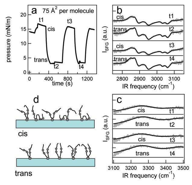 圖6。在脂質(zhì)/H2O界面處,DT Azo-5P/d75 DPPC的1:5混合物的結(jié)果,每個(gè)分子的面積為60?2。(a) 表面壓力與時(shí)間的關(guān)系。用370和450 nm光照射~100秒分別產(chǎn)生順式(高壓)和反式(低壓)狀態(tài)。壓力的微小劇烈波動(dòng)是由于樣品高度的變化,以校正水的蒸發(fā)。(b) 相應(yīng)的VSFG光譜(灰色)以及CD區(qū)域的擬合。為了清晰起見,光譜已被抵消。(c) VSFG光譜(灰色)以及用于引導(dǎo)眼睛進(jìn)入CH區(qū)域的擬合。底部曲線顯示了在P時(shí)純d75 DPPC的光譜~ 40百萬(wàn)/米。(d) 脂質(zhì)尾部方向的示意圖。光開關(guān)脂質(zhì)的偶氮苯部分用灰色圓圈表示。
