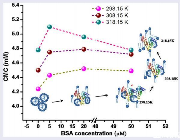 用表面張力法研究了牛血清白蛋白對(duì)IL型gemini表面活性劑[C10-4-C10im]Br2表面性質(zhì)的影響。研究了不同溫度下臨界膠束濃度(CMC)與BSA濃度的關(guān)系。[C10-4-C10im]Br2的CMC隨著BSA濃度的增加以及系統(tǒng)溫度的升高而增加。界面參數(shù),即;計(jì)算了最大表面過(guò)量濃度(Γmax)、每分子最小面積(Amin)和CMC下的表面壓力(ΔCMC)。此外,利用表面張力數(shù)據(jù)評(píng)估了吸附和膠束化的熱力學(xué)參數(shù)。結(jié)果表明,[C10-4-C10im]Br2與BSA的結(jié)合是自發(fā)的、放熱的。該過(guò)程是熵驅(qū)動(dòng)的,疏水相互作用是主要驅(qū)動(dòng)力。