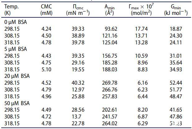 表1.[C10-4-C10im]Br2在不同溫度下存在不同濃度BSA時的界面參數(shù)。