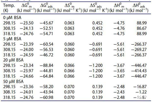 計算了在不同濃度和溫度下[C10-4-C10im]Br2在不存在和存在BSA的情況下的膠束化和吸附熱力學參數(shù),以確定溫度和BSA濃度的升高是否有利于膠束化(本體相濃度)或吸附 [C10-4-C10im]Br2的(界面濃度)。使用以下關(guān)系式計算各種熱力學參數(shù)。[79]