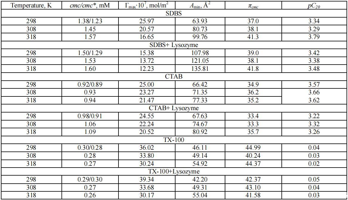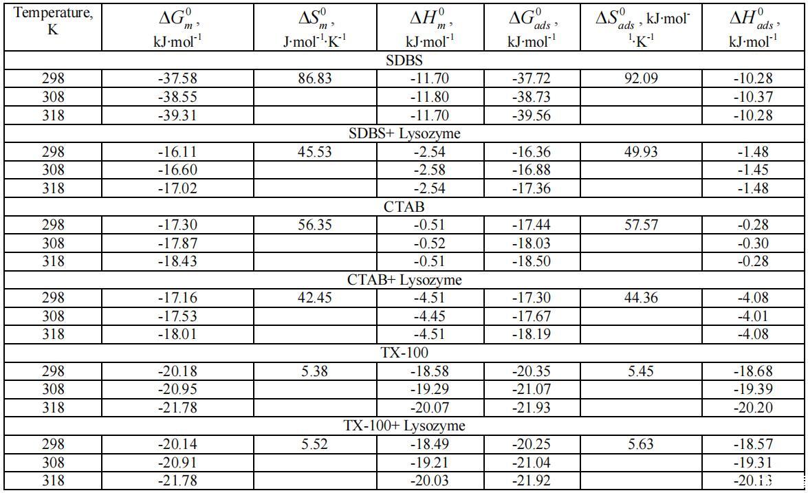 在溶菌酶存在和不存在的情況下,不同種類表面活性劑的物理化學(xué)和熱力學(xué)性質(zhì)如下所述: